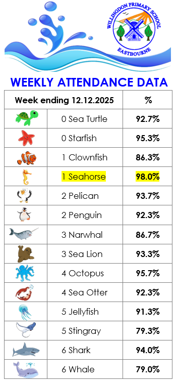 We are very proud of our good attendance at Willingdon Primary School and we always strive to reach our aspiring whole school targets set at 97%.